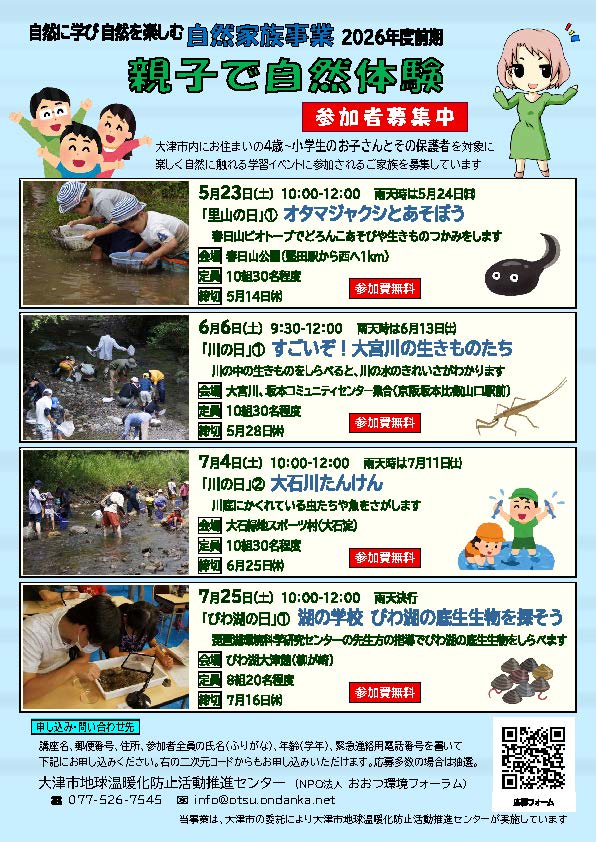 自然に学び、自然を楽しむ「自然家族事業2026」の開催予定についてお知らせします。 2026年度の「自然家族事業2026」は、次の内容で開催を予定しています。 「自然家族事業2026」は、大津市にお住いの4歳~小学生のお […]