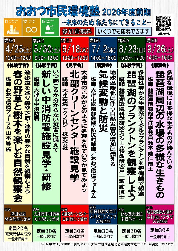 おおつ市民環境塾2026年度前期の開催予定について(お知らせ)おおつ市民環境塾2026年度 前期の開催予定についてお知らせします。 前期の環境塾は、次の内容で開催を予定しています。今後、事業の詳細等については、順次、当センターHPや「広報おおつ」等でもお知らせします。 講座 番号 […]