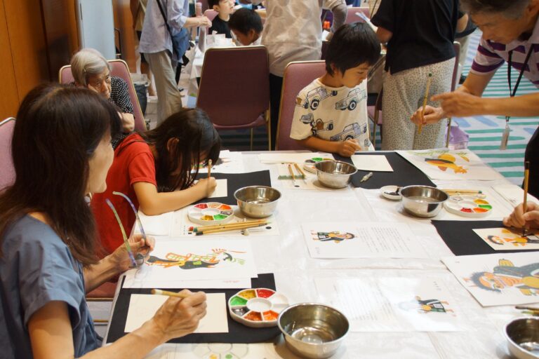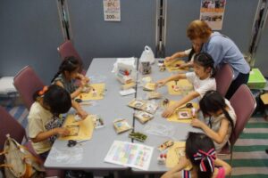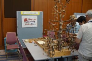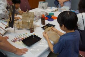 ヨシ紙に大津絵を書くことができるブース ヨシやどんぐりなどを麻ひもに通して ペンダントやタペストリーを作ることができるブース