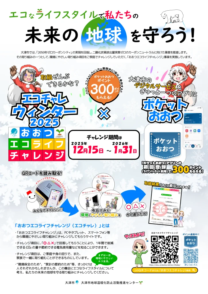 電力消費量が増加する冬に合わせて、12月15日(月)~ 1月31日(土)まで、「おおつエコライフチャレンジ ウインター 2025」を実施します。