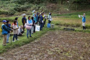 最後に、里山保全プロジェクトメンバーが保全管理する棚田の見学です。生物多様性や水源や災害の防止、食料や木材などの資源供給、また野生動物と人間社会の緩衝地帯として、美しい景観も含め、里山が持つ役割は広く大きいものであると感じます。