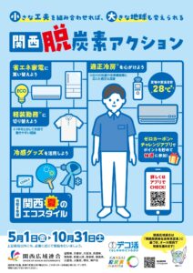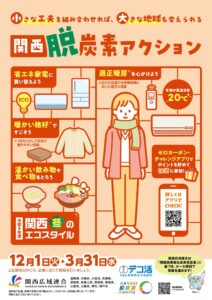 関西広域連合では、温室効果ガス削減のための広域取組として、「関西脱炭素アクション」を統一ポスター等により、広く呼びかけを行います。